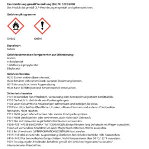 EUH211 Achtung! Beim Sprühen können gefährliche lungengängige Tröpfchen entstehen. Aerosol oder Nebel